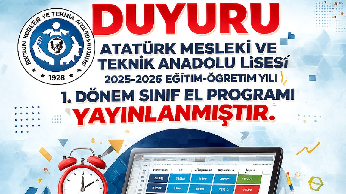 Atatürk Mesleki ve Teknik Anadolu Lisesi 2025-2026 Eğitim-Öğretim Yılı 1. Dönem Sınıf El Programı için aşağıdaki bağlantıyı tıklayın.