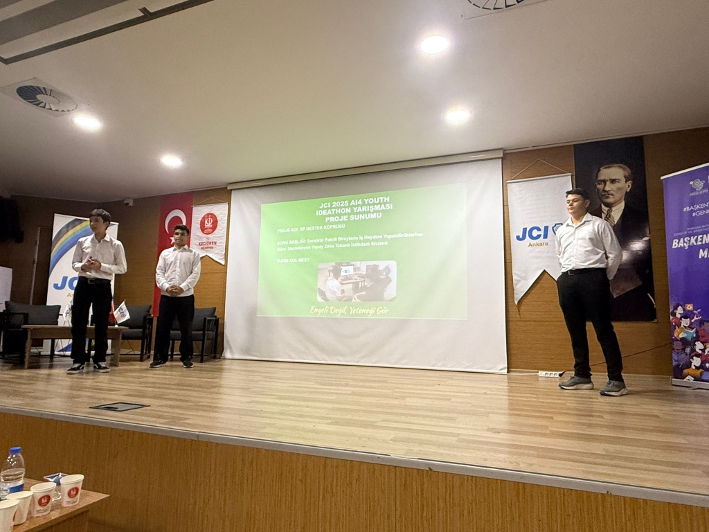 JCI Ankara yürütücülüğünde ve Keçiören Belediyesi ev sahipliğinde gerçekleşen AI 4 Youth (Gençler için Yapay Zeka) projesi kapsamında düzenlenen yarışmada Bilişim Teknolojileri Alanı 10. Sınıf öğrencimiz Eren GEYLAN, “SP Destek Köprüsü” isimli proje ile takım olarak ikincilik ödülüne layık görüldü. Projede serebral palsi olan bireylerin yapay zeka destekli bir iş arama ve eşleştirme uygulaması hazırlayan öğrencilerin projesi büyük ilgi gördü.